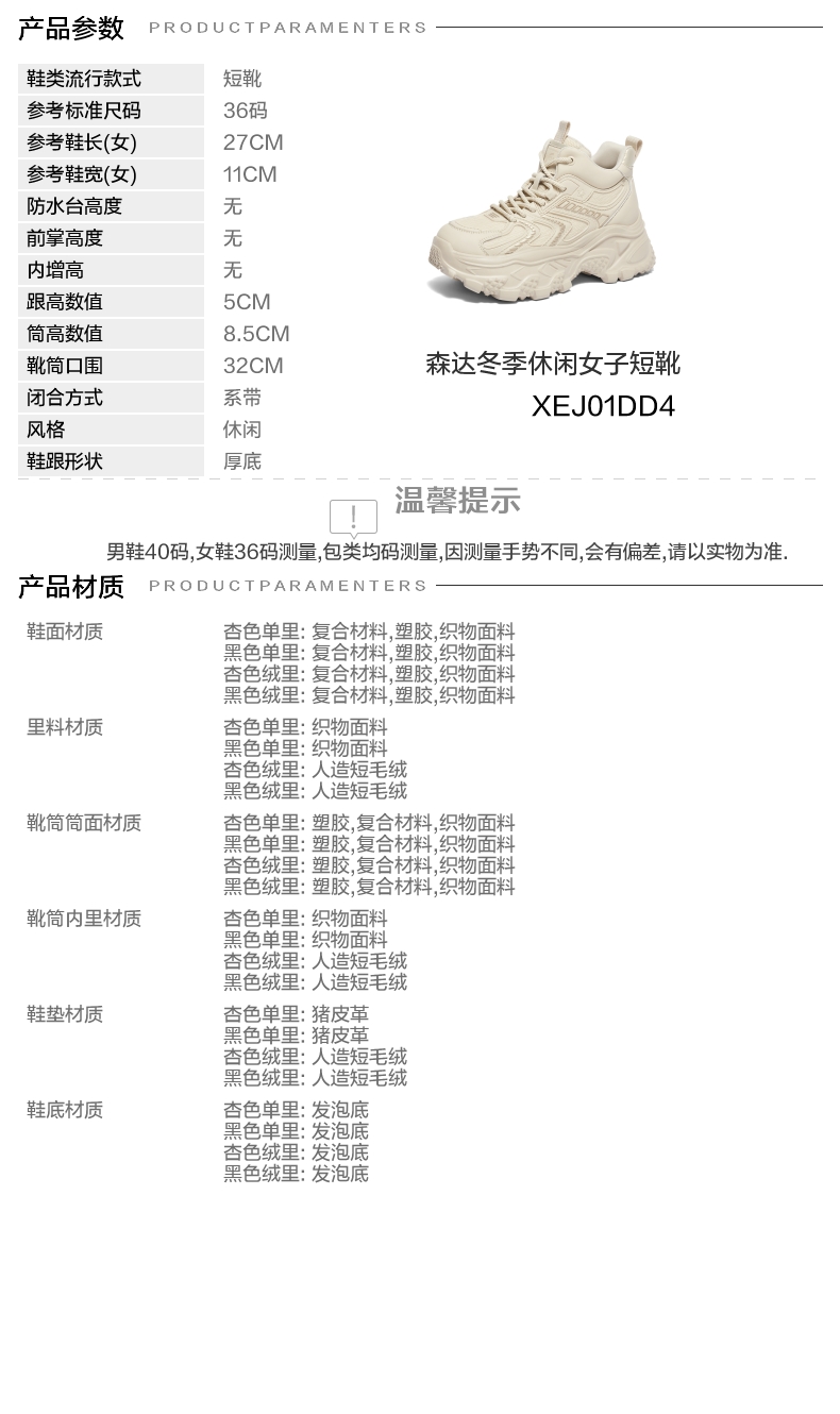 | 靴筒口围:32CM | 风格分类:老爹鞋 | 上市时间:2024年冬季 | 生产/经销/进口厂家:江苏新森达鞋业有限公司 | 鞋类流行款式:短靴 |