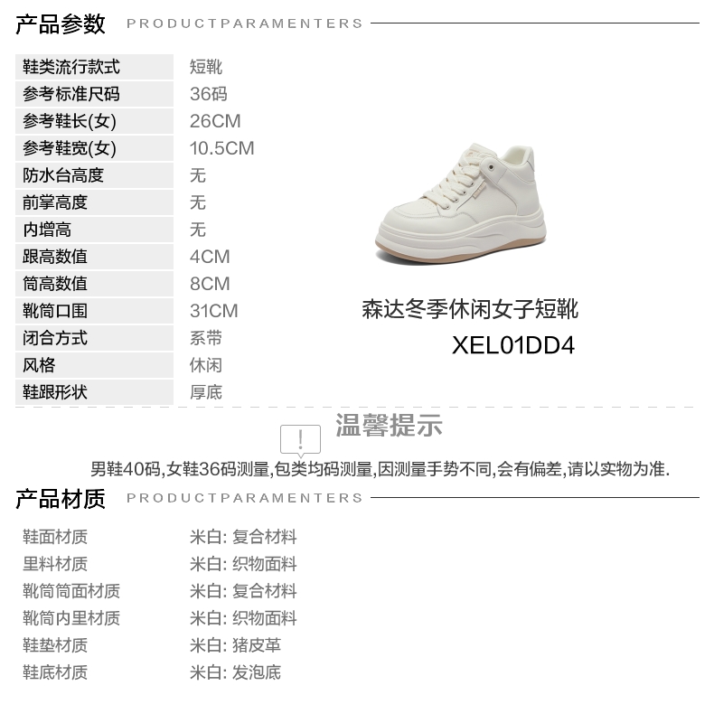 | 参考鞋宽(女):10.5CM | 风格:休闲 | 色系:白色 | 跟高数值:4CM | 筒高数值:8CM |