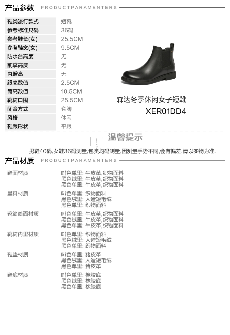 | 帮面材质:织物牛皮革 | 配跟:无 | 靴筒口围:25.5CM | 上市时间:2024年冬季 | 鞋类流行款式:短靴 |