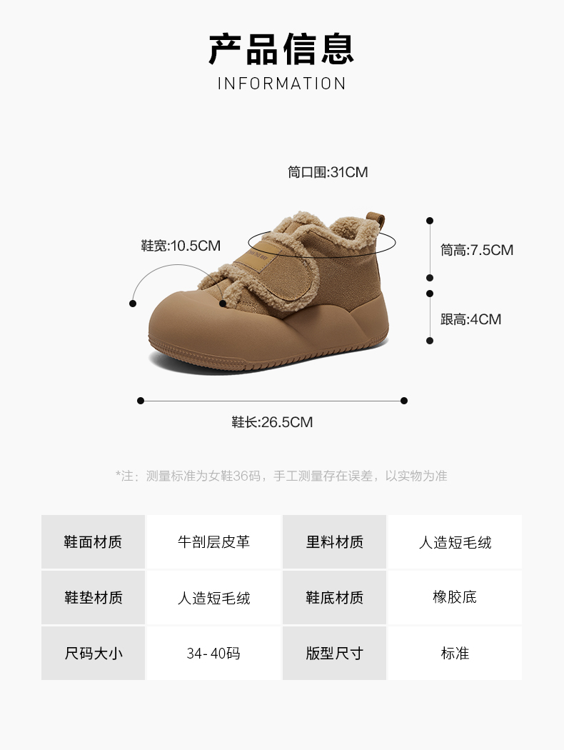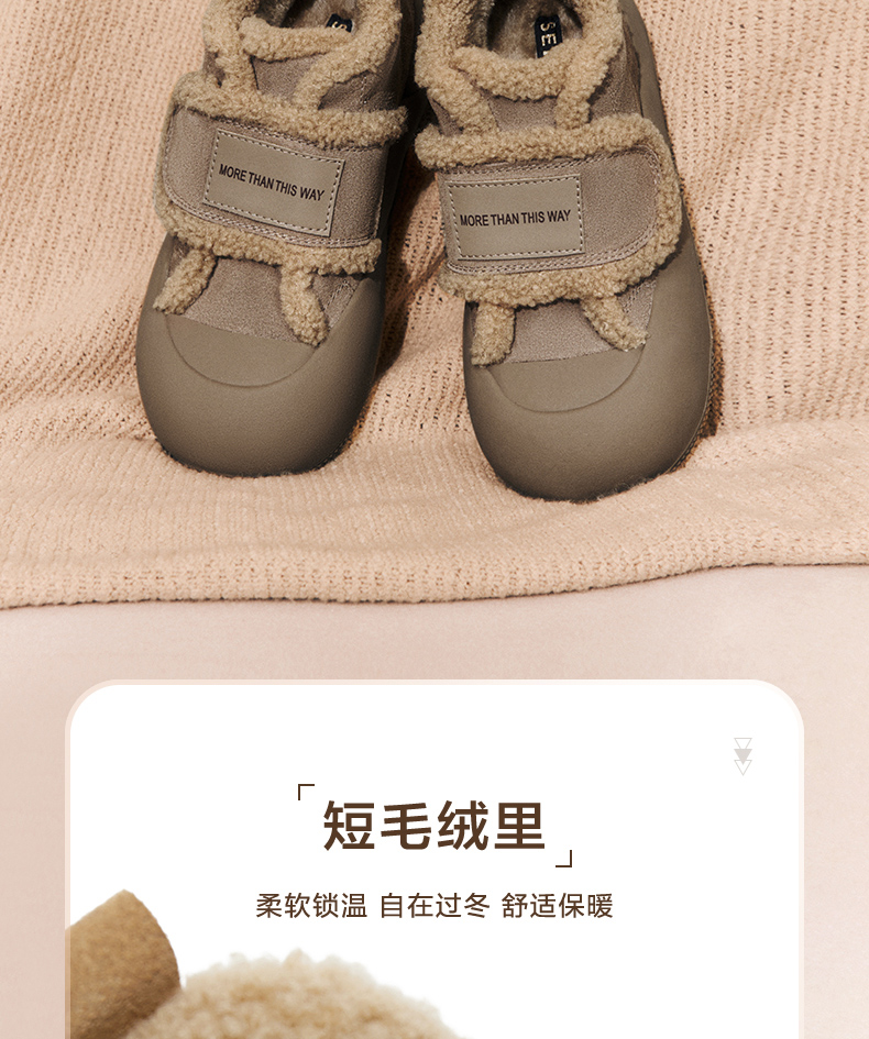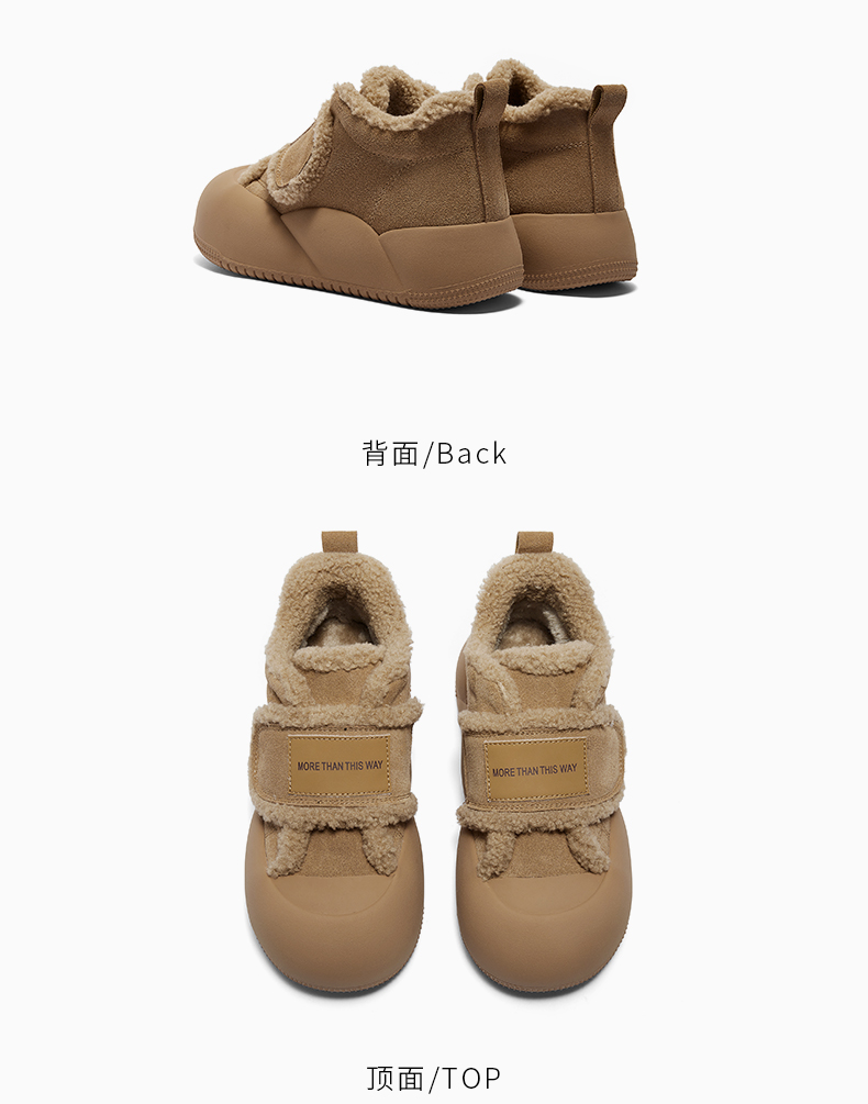| 鞋底材质:橡胶底 | 靴筒内里材质:人造短毛绒 | 内增高:无 | 鞋面材质:牛剖层皮革 | 闭合方式:魔术贴 |