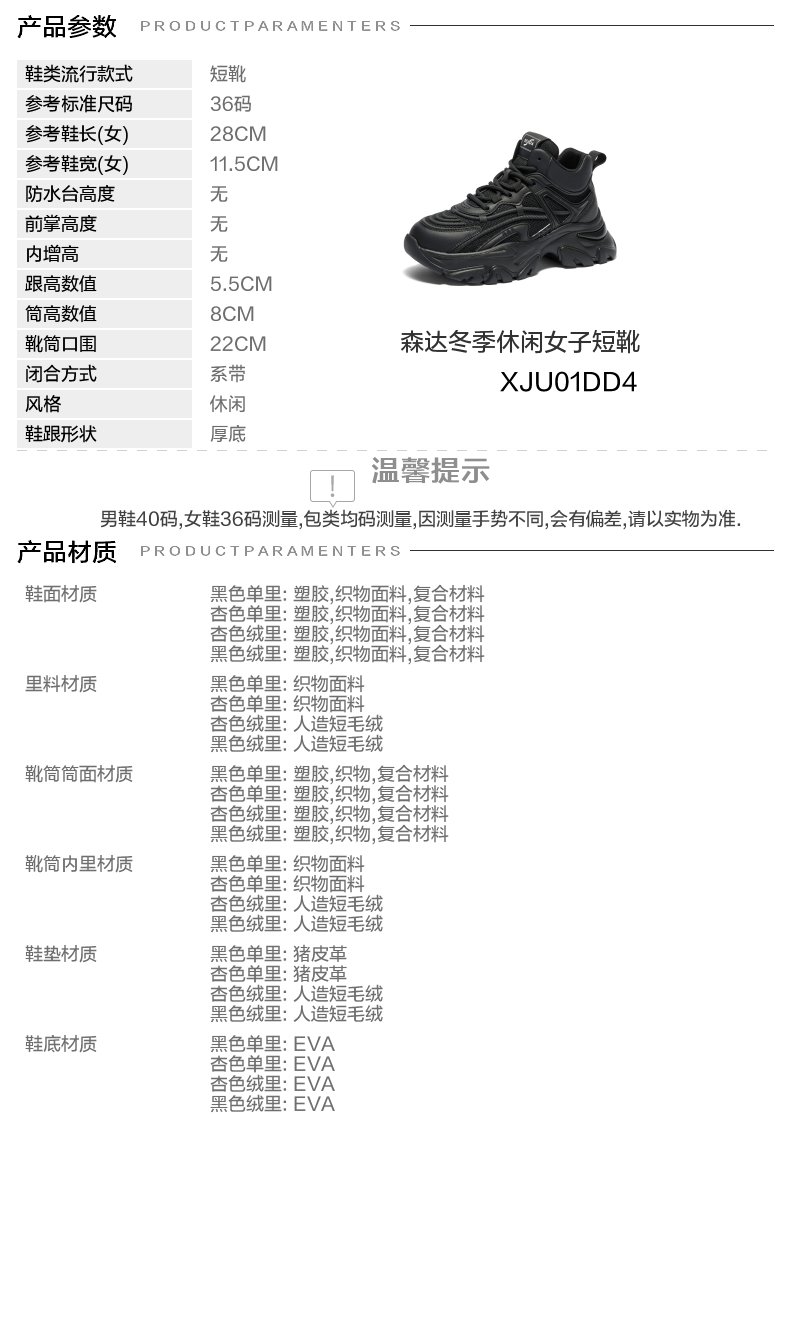 | 参考鞋宽(女):11.5CM | 风格:休闲 | 色系:黑色 | 跟高数值:5.5CM | 筒高数值:8CM |