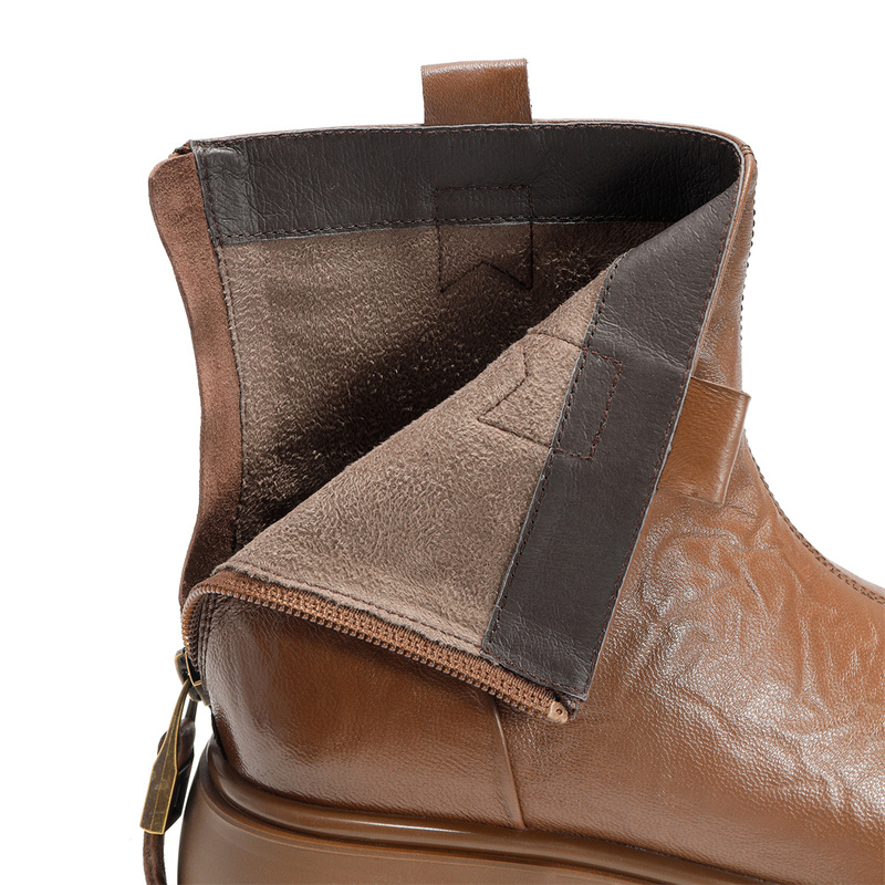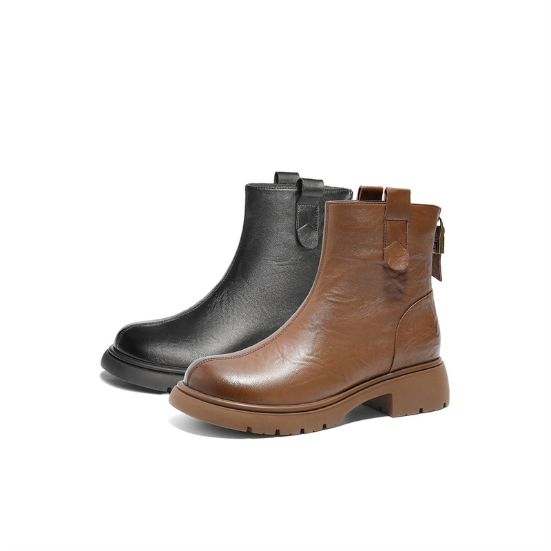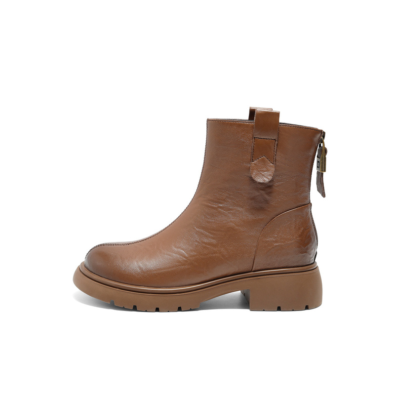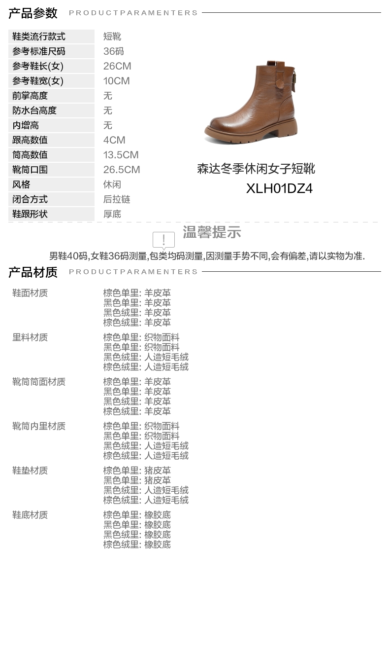 | 鞋底材质:橡胶底 | 靴筒内里材质:织物面料 | 内增高:无 | 鞋面材质:羊皮革 | 闭合方式:后拉链 |