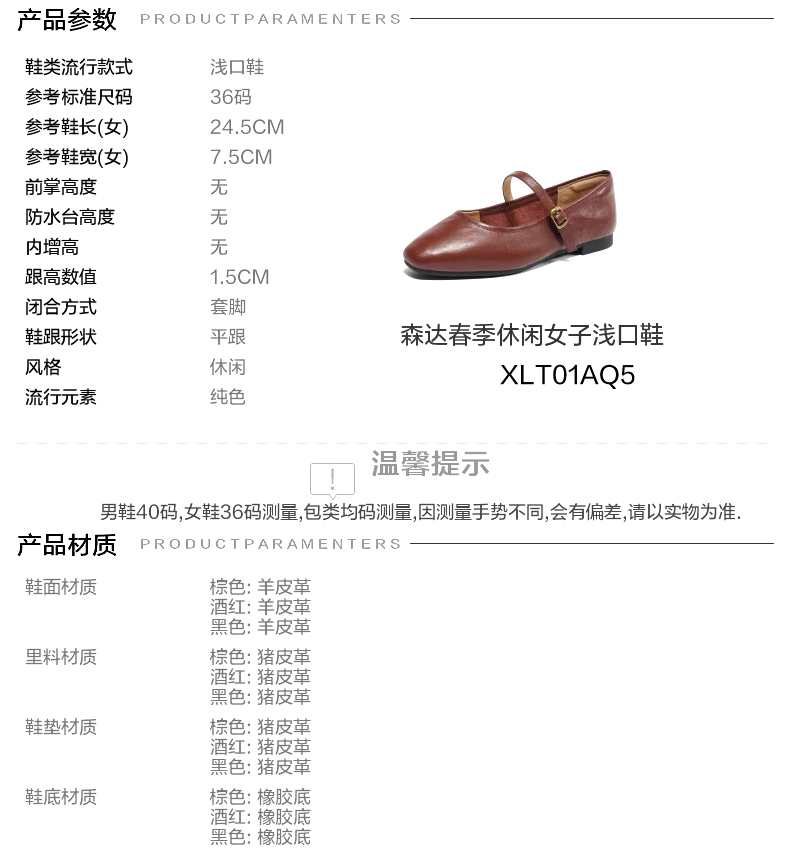 | 生产/经销/进口厂家:江苏新森达鞋业有限公司 | 鞋类流行款式:浅口鞋 | 鞋头款式:圆头 | 执行标准:舒适上班鞋 Q/320925XSD 001-2023 | 跟高范围:低跟鞋(小于3CM) |