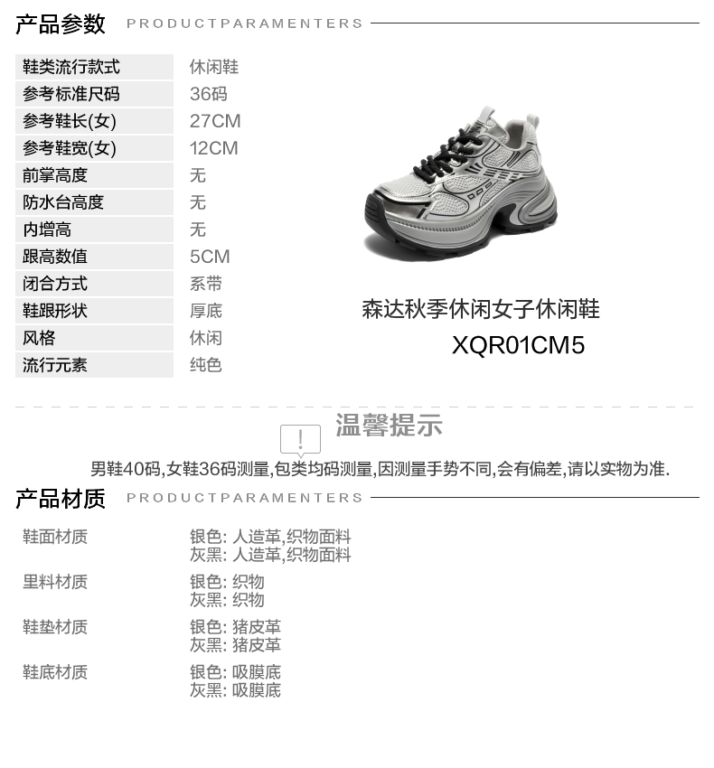 | 色系:灰色 | 跟高数值:5CM | 性别:女子 | 里料材质:织物 | 制鞋工艺:胶贴皮鞋 |