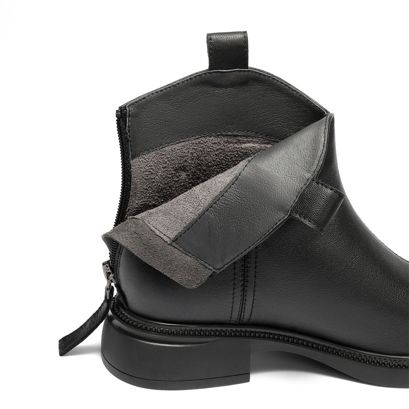 | 鞋底材质:橡胶底 | 靴筒内里材质:猪皮革织物面料 | 内增高:无 | 鞋面材质:羊皮革 | 闭合方式:后拉链 |