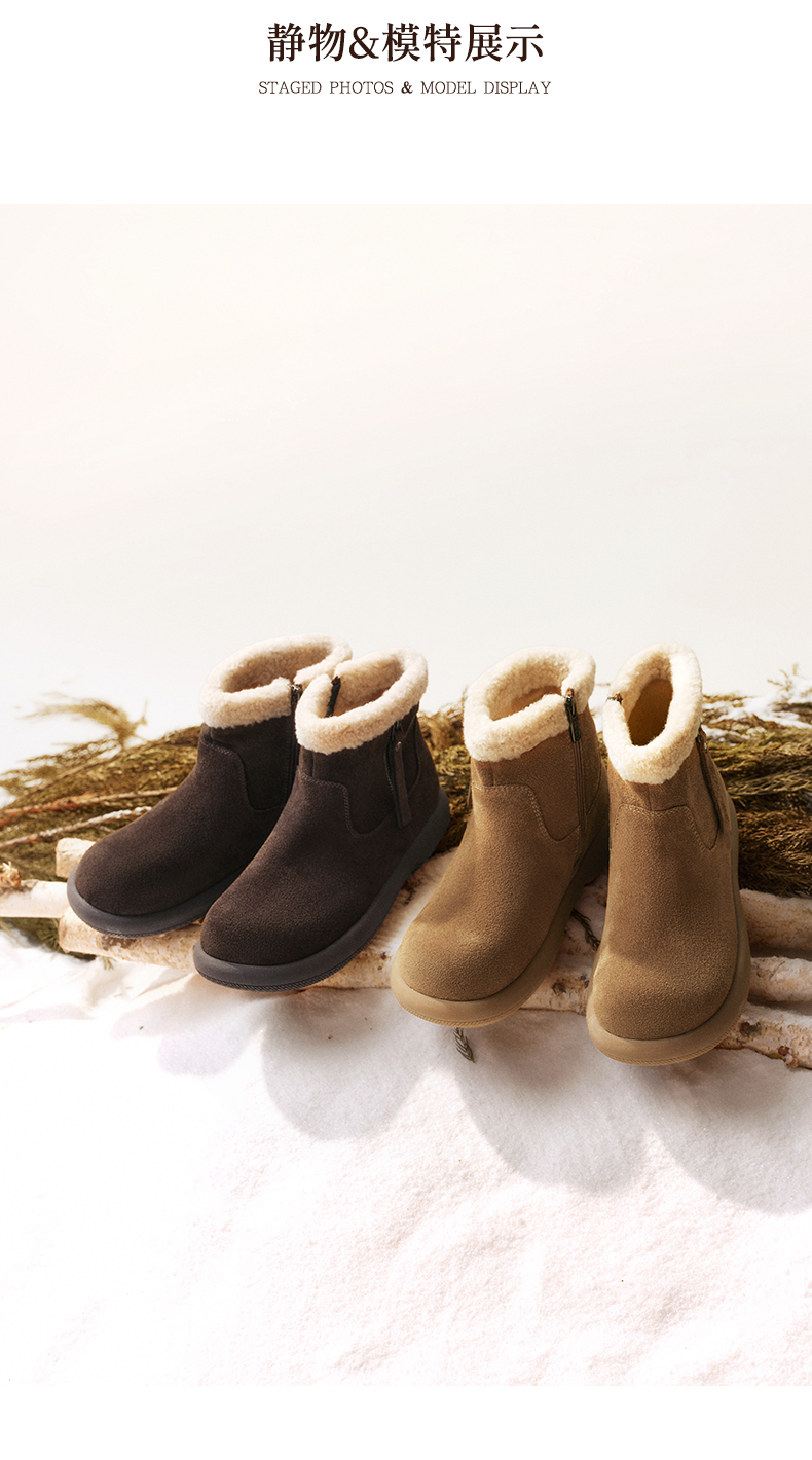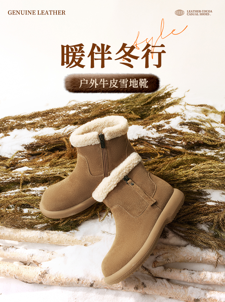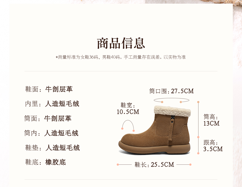 | 靴筒筒面材质:牛剖层革 | 里料材质:人造短毛绒 | 制鞋工艺:胶贴皮鞋 | 鞋垫材质:人造短毛绒 | 款式季节:冬季 |