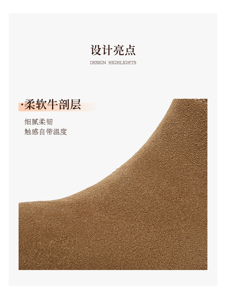 | 鞋底材质:橡胶底 | 靴筒内里材质:人造短毛绒 | 内增高:无 | 鞋面材质:牛剖层革 | 闭合方式:侧拉链 |