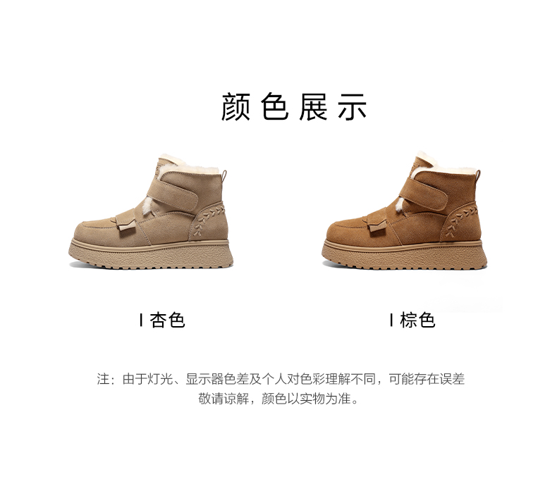 | 靴筒筒面材质:牛剖层革 | 里料材质:人造长毛绒 | 制鞋工艺:胶贴皮鞋 | 鞋垫材质:人造长毛绒 | 款式季节:冬季 |