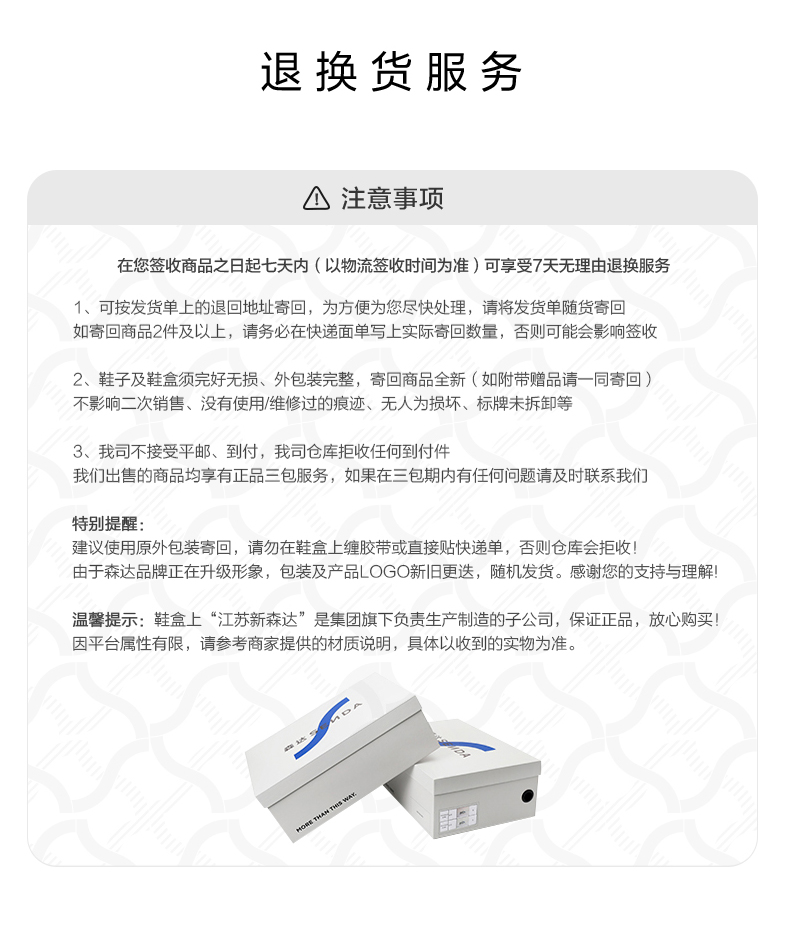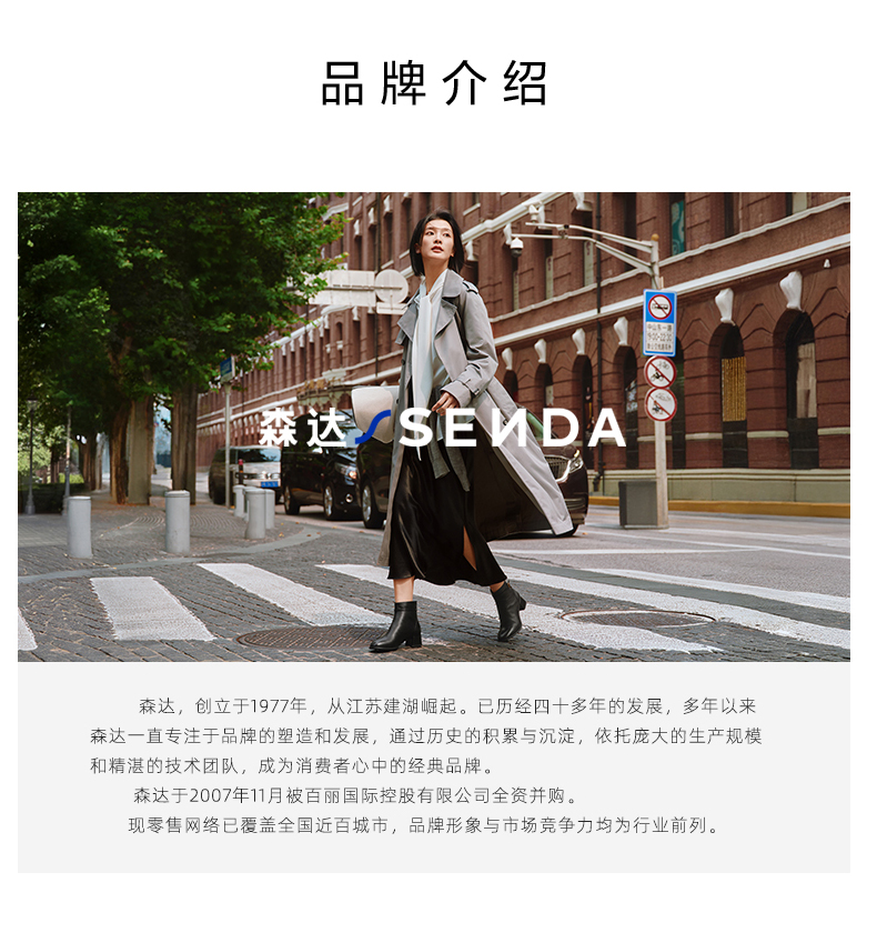 SENDA(森达),品牌成立于1977年,拥有40年发展史,秉承舒适的制鞋理念,从用料到工艺都经过严格质量把控。男鞋以舒适质感著称,覆盖商务正装、商务休闲、时尚休闲三大系列,适用不同场合的需求,同时开发摩克、加州等一系列功能性鞋履,行走体验;女鞋以款式优雅、穿着舒适为主要特征,依时尚潮流添加当季设计元素,每季推出时尚、休闲等系列鞋款,为都市白领提供不同场合的搭配需求。目前门店已覆盖近百座城市,数量达1800多家。