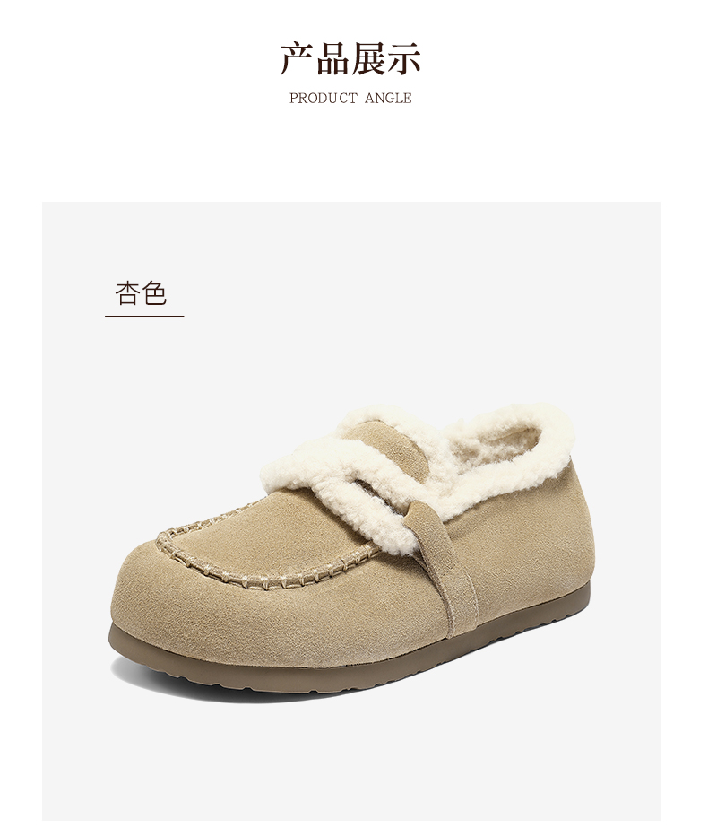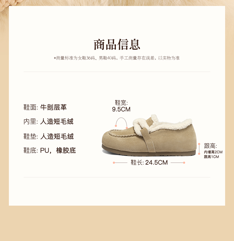 | 色系:杏色 | 跟高数值:1CM | 性别:女子 | 里料材质:人造短毛绒 | 制鞋工艺:胶贴皮鞋 |