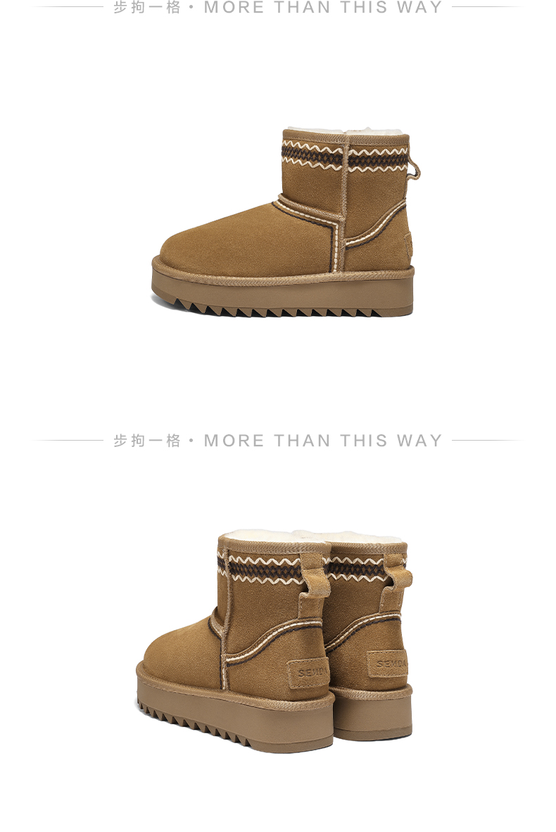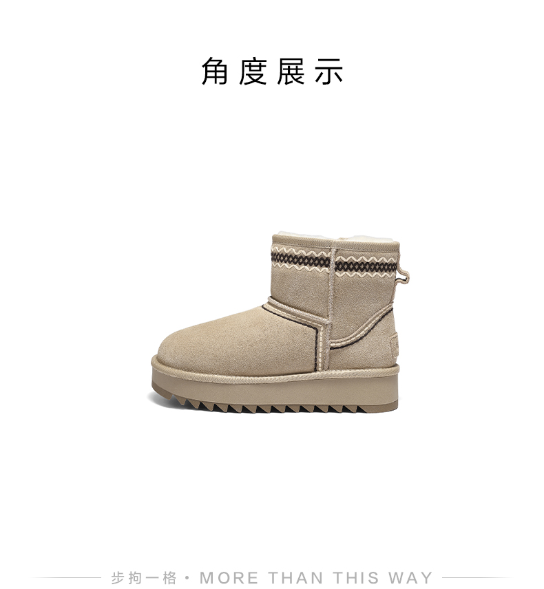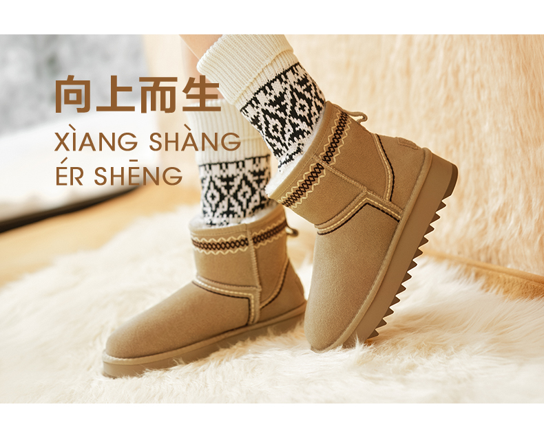 | 靴筒筒面材质:牛剖层革 | 里料材质:人造长毛绒 | 制鞋工艺:胶贴皮鞋 | 鞋垫材质:人造长毛绒 | 款式季节:冬季 |