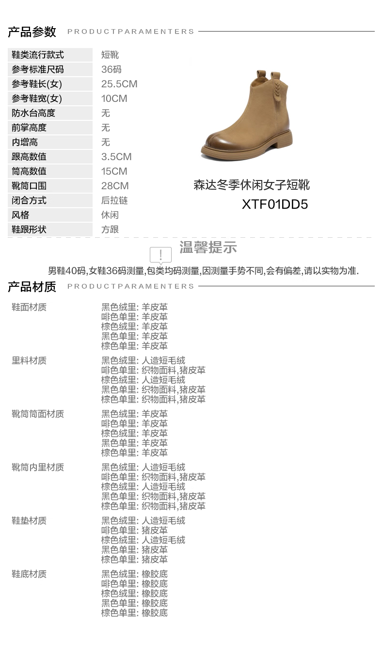 | 鞋底材质:橡胶底 | 靴筒内里材质:人造短毛绒 | 内增高:无 | 鞋面材质:羊皮革 | 闭合方式:后拉链 |