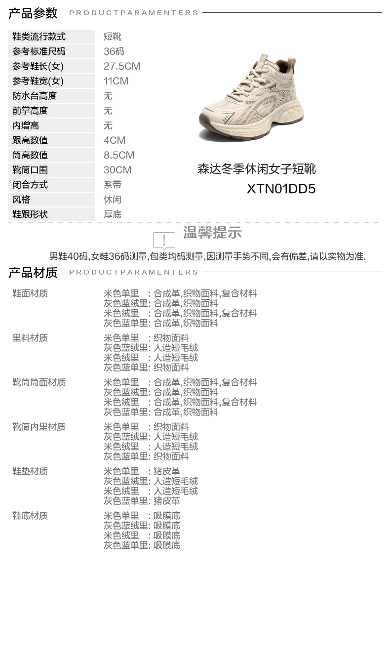 | 参考鞋宽(女):11CM | 风格:休闲 | 色系:米色 | 跟高数值:4CM | 筒高数值:8.5CM |