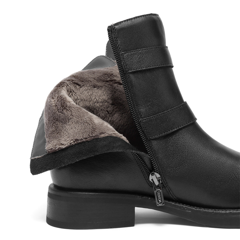 | 鞋底材质:橡胶底 | 靴筒内里材质:人造短毛绒 | 内增高:无 | 鞋面材质:羊皮革 | 闭合方式:侧拉链 |