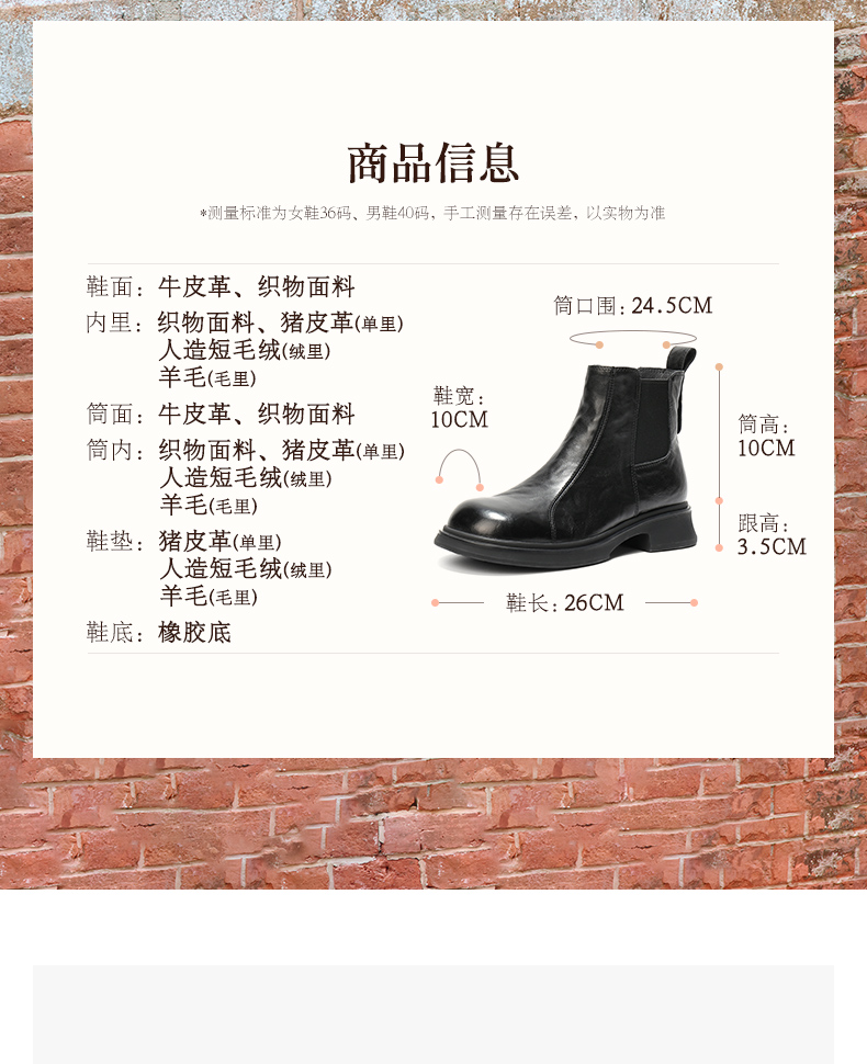| 配跟:无 | 靴筒口围:24.5CM | 上市时间:2025年冬季 | 鞋类流行款式:短靴 | 鞋头款式:圆头 |