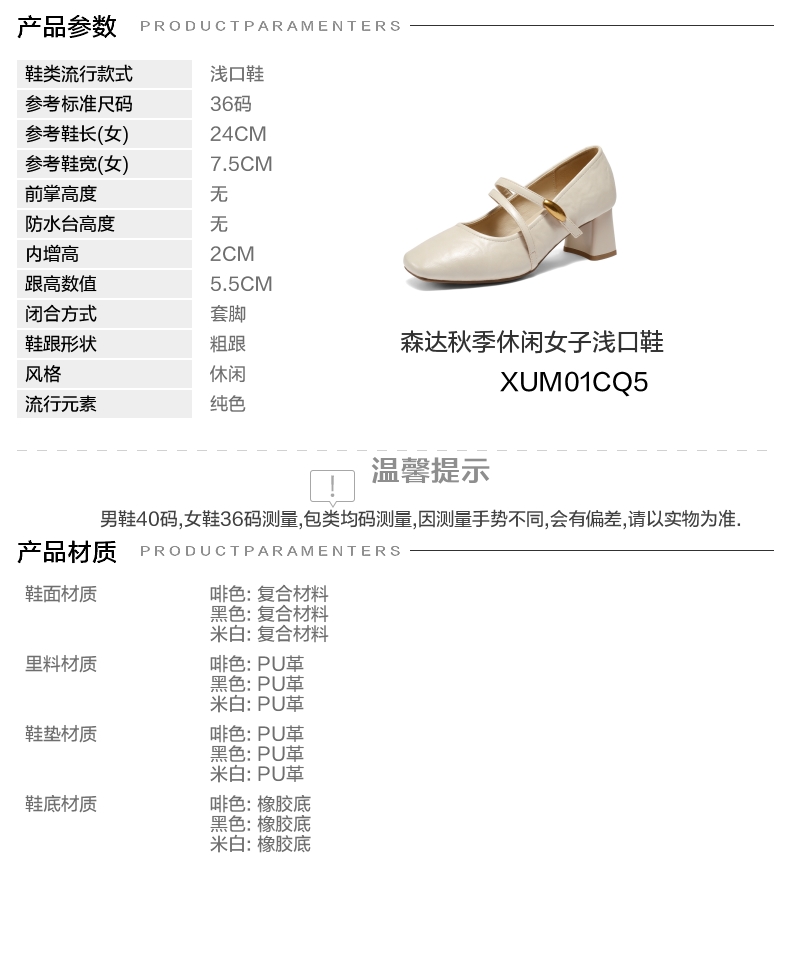 | 鞋头款式:方头 | 鞋底材质:橡胶底 | 鞋面图案:纯色 | 内增高:2CM | 鞋跟形状:粗跟 |