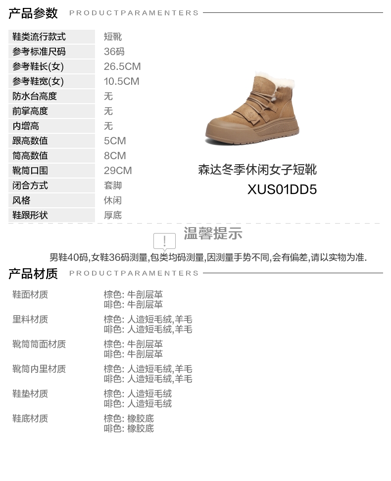 | 靴筒筒面材质:牛剖层革 | 里料材质:羊毛人造短毛绒 | 制鞋工艺:胶贴皮鞋 | 鞋垫材质:人造短毛绒 | 款式季节:冬季 |