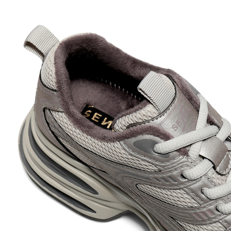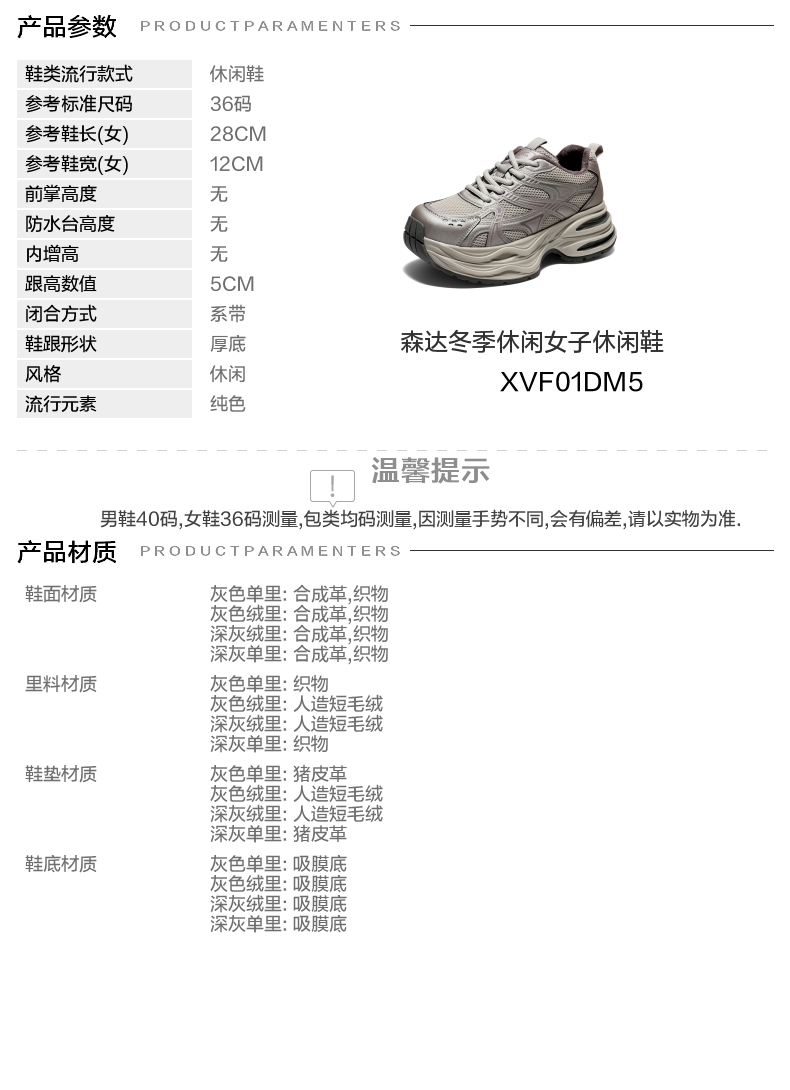 | 色系:灰色 | 跟高数值:5CM | 性别:女子 | 里料材质:人造短毛绒 | 制鞋工艺:胶贴皮鞋 |