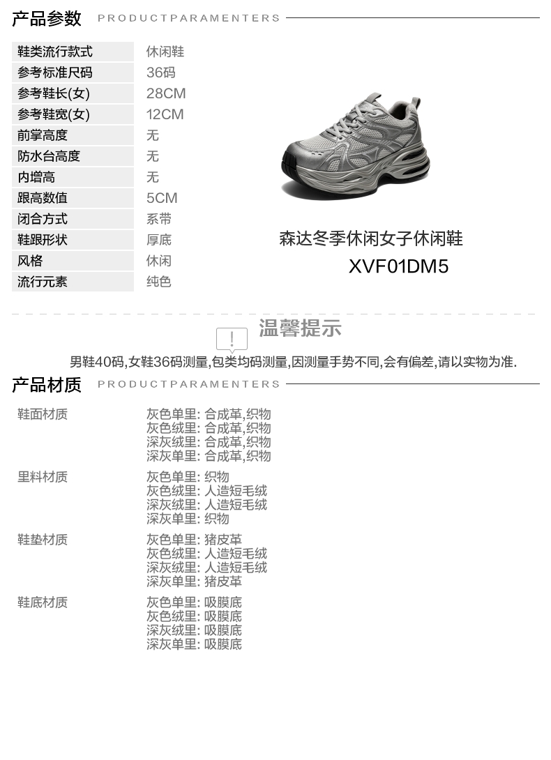 | 色系:灰色 | 跟高数值:5CM | 性别:女子 | 里料材质:人造短毛绒 | 制鞋工艺:胶贴皮鞋 |