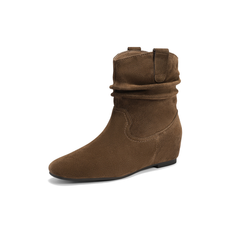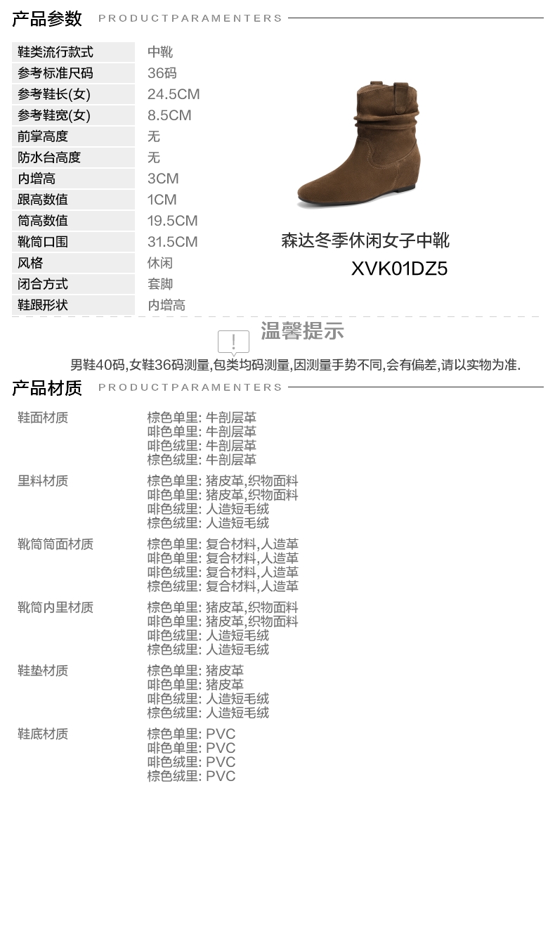 | 鞋底材质:PVC | 靴筒内里材质:织物面料猪皮革 | 内增高:3CM | 鞋面材质:牛剖层革 | 闭合方式:套脚 |