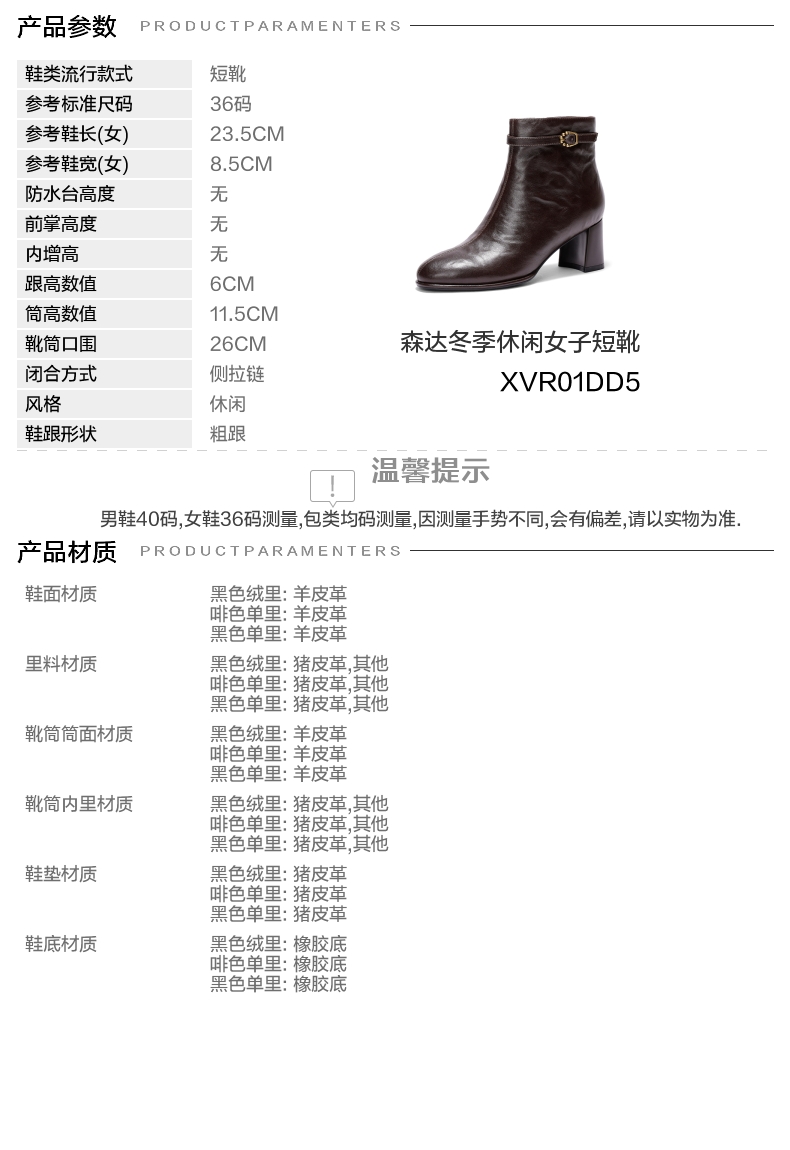| 鞋底材质:橡胶底 | 靴筒内里材质:猪皮革其他 | 内增高:无 | 鞋面材质:羊皮革 | 闭合方式:侧拉链 |