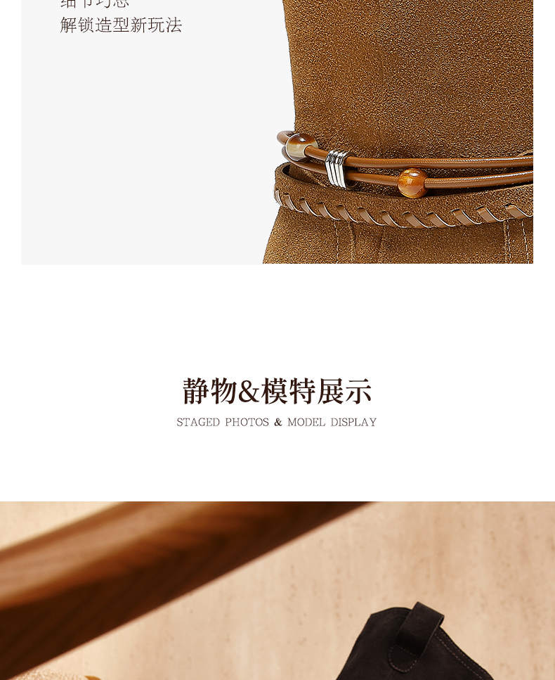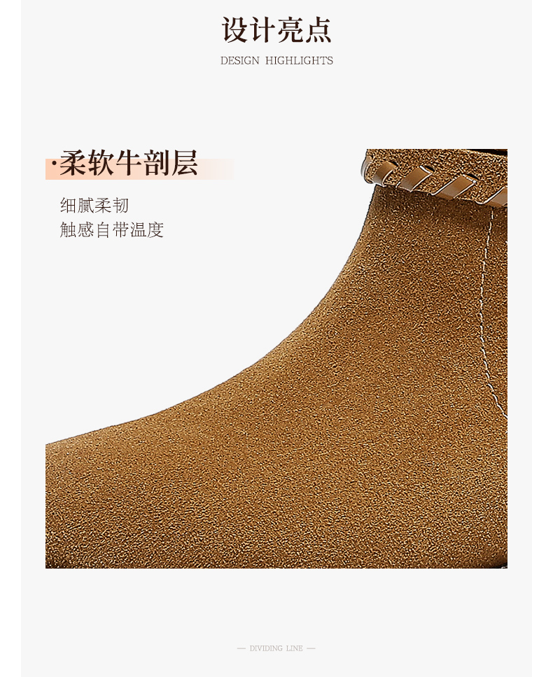 | 靴筒筒面材质:牛剖层革 | 里料材质:人造短毛绒 | 制鞋工艺:胶贴皮鞋 | 鞋垫材质:人造短毛绒 | 款式季节:冬季 |