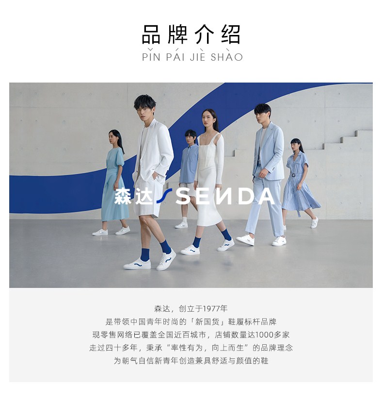 SENDA(森达),品牌成立于1977年,拥有40年发展史,秉承舒适的制鞋理念,从用料到工艺都经过严格质量把控。男鞋以舒适质感著称,覆盖商务正装、商务休闲、时尚休闲三大系列,适用不同场合的需求,同时开发摩克、加州等一系列功能性鞋履,行走体验;女鞋以款式优雅、穿着舒适为主要特征,依时尚潮流添加当季设计元素,每季推出时尚、休闲等系列鞋款,为都市白领提供不同场合的搭配需求。目前门店已覆盖近百座城市,数量达1800多家。