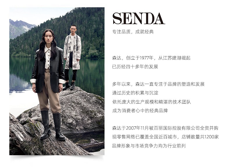 SENDA(森达),品牌成立于1977年,拥有40年发展史,秉承舒适的制鞋理念,从用料到工艺都经过严格质量把控。男鞋以舒适质感著称,覆盖商务正装、商务休闲、时尚休闲三大系列,适用不同场合的需求,同时开发摩克、加州等一系列功能性鞋履,行走体验;女鞋以款式优雅、穿着舒适为主要特征,依时尚潮流添加当季设计元素,每季推出时尚、休闲等系列鞋款,为都市白领提供不同场合的搭配需求。目前门店已覆盖近百座城市,数量达1800多家。
