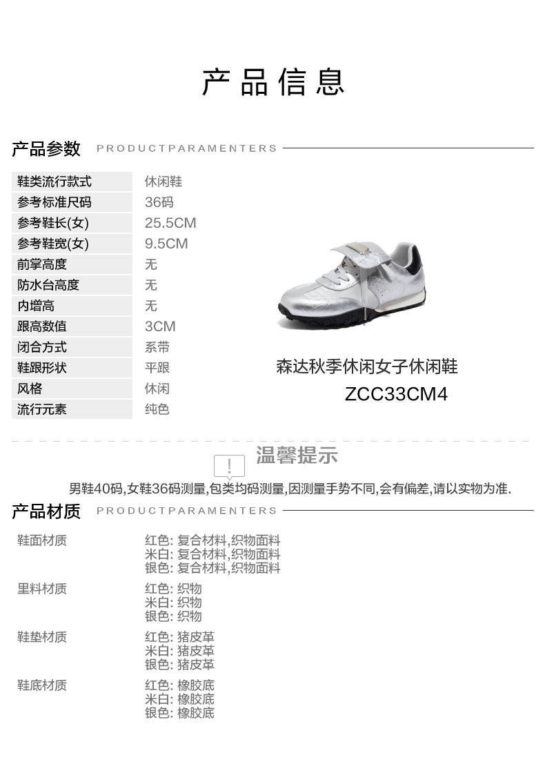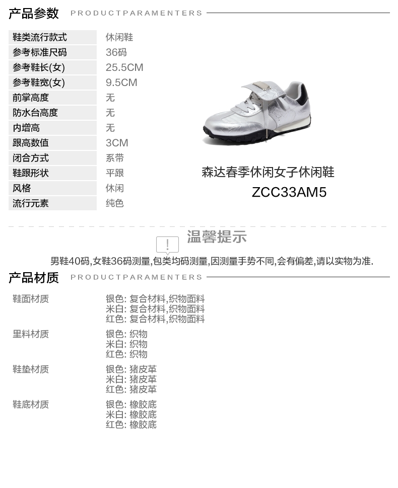 | 参考鞋长(女):25.5CM | 参考鞋宽(女):9.5CM | 风格:休闲 | 色系:银色 | 参考标准尺码:36码 |