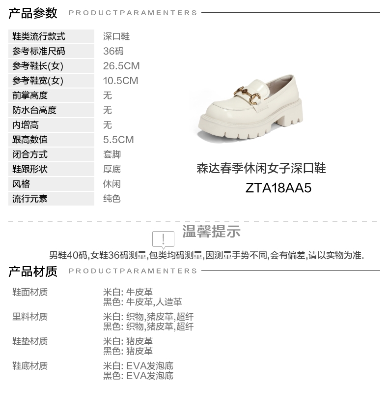 | 上市时间:2025年春季 | 生产/经销/进口厂家:江苏新森达鞋业有限公司 | 鞋类流行款式:深口鞋 | 鞋头款式:圆头 | 执行标准:舒适上班鞋 Q/320925XSD 001-2023 |