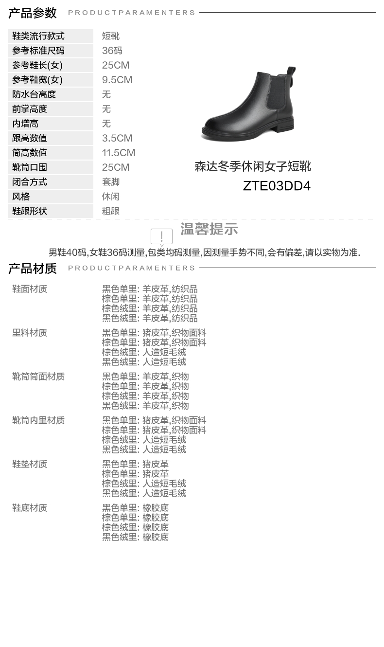 | 参考鞋宽(女):9.5CM | 风格:休闲 | 色系:黑色 | 跟高数值:3.5CM | 筒高数值:11.5CM |
