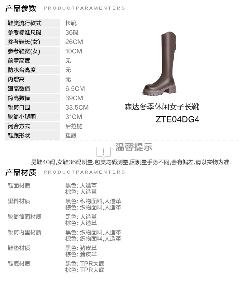 | 风格:休闲 | 色系:棕色 | 跟高数值:6.5CM | 性别:女子 | 筒高数值:39CM |
