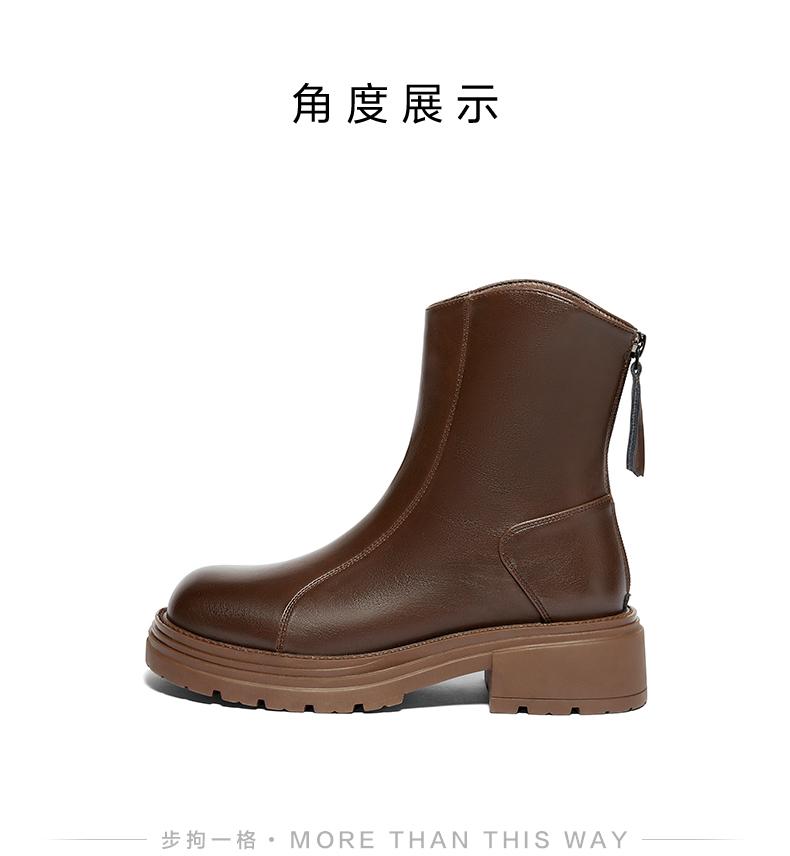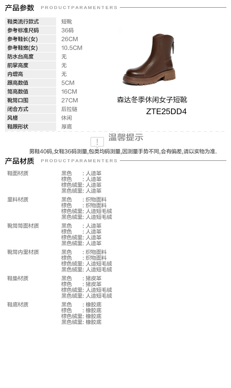| 鞋底材质:橡胶底 | 靴筒内里材质:织物面料 | 内增高:无 | 鞋面材质:人造革 | 闭合方式:后拉链 |