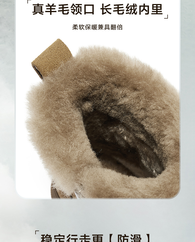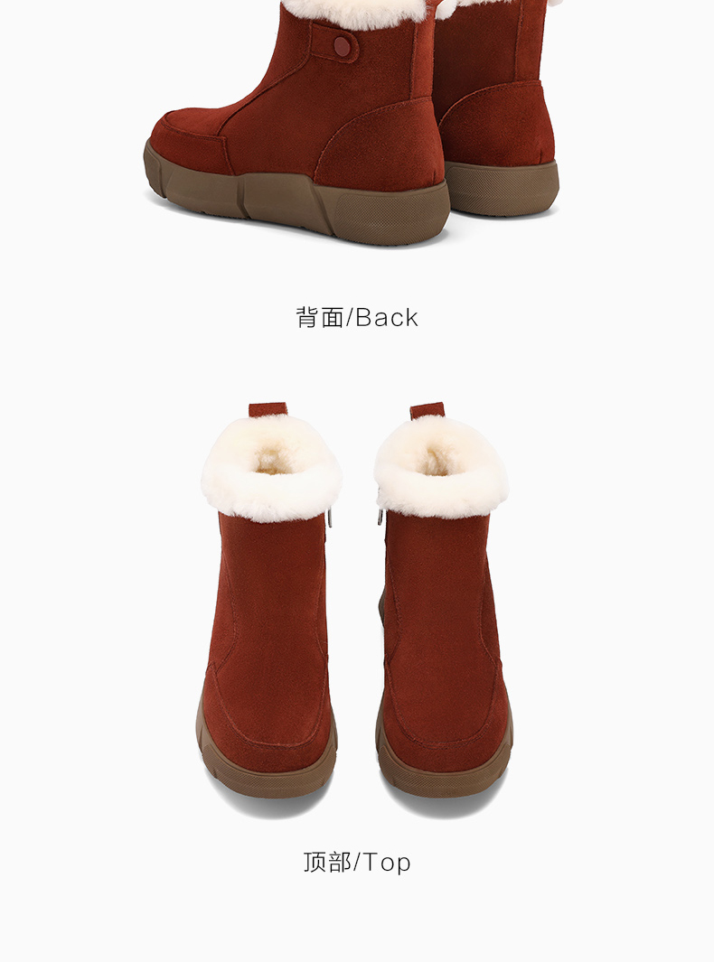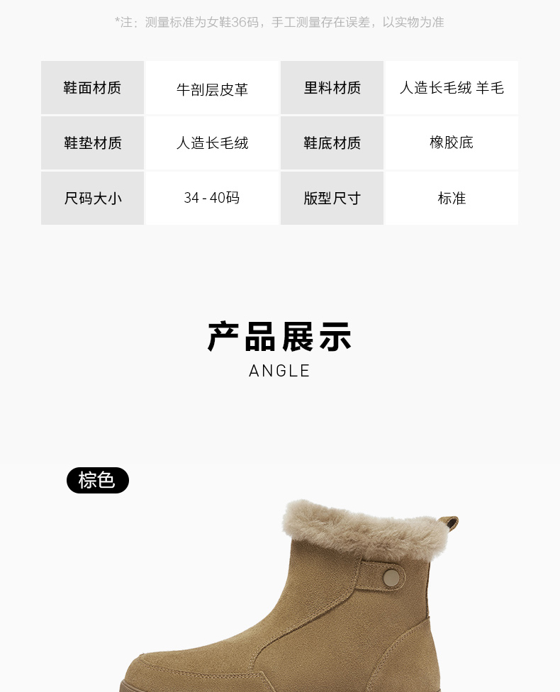 | 鞋底材质:橡胶底 | 靴筒内里材质:羊毛人造长毛绒 | 内增高:无 | 鞋面材质:牛剖层皮革 | 闭合方式:侧拉链 |