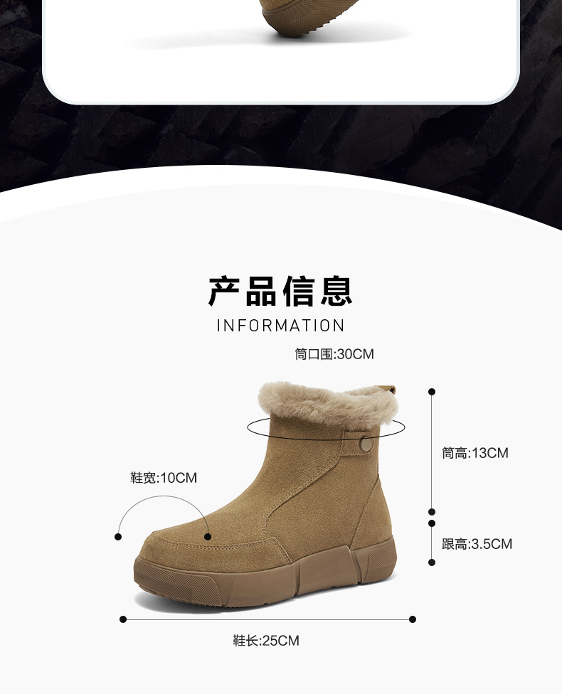 | 帮面材质:牛剖层革 | 配跟:无 | 靴筒口围:30CM | 上市时间:2024年冬季 | 鞋类流行款式:短靴 |