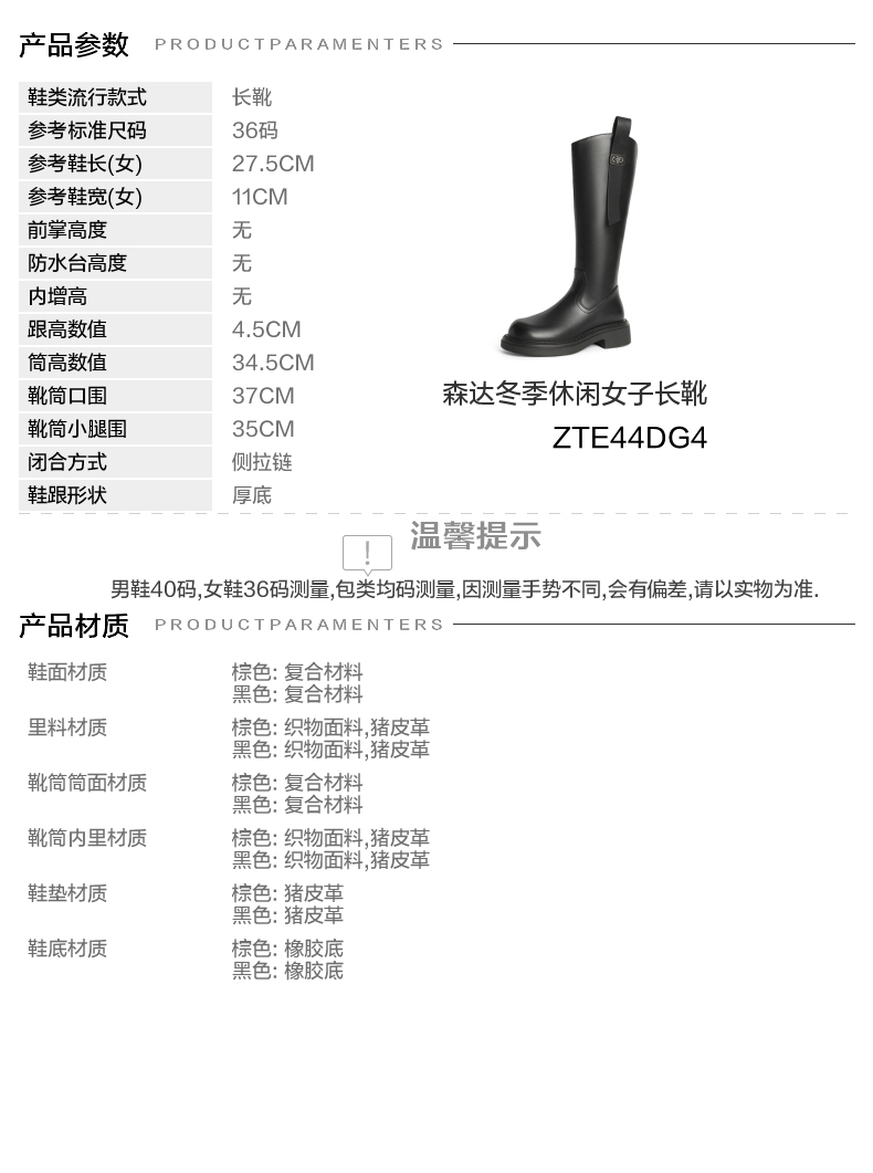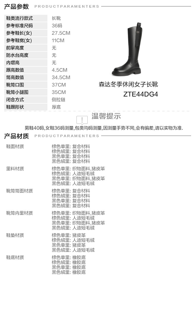 | 靴筒筒面材质:复合材料 | 靴筒小腿围:35CM | 里料材质:织物面料猪皮革 | 制鞋工艺:胶贴皮鞋 | 鞋垫材质:猪皮革 |