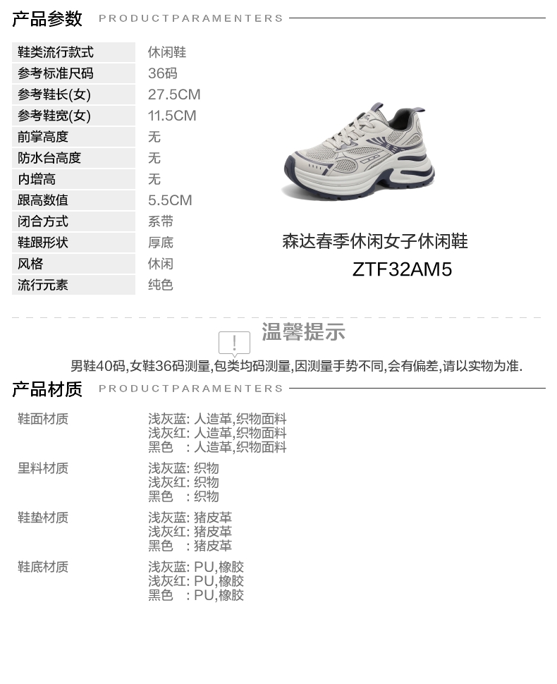 | 上市时间:2025年春季 | 生产/经销/进口厂家:江苏新森达鞋业有限公司 | 鞋类流行款式:休闲鞋 | 鞋头款式:圆头 | 执行标准:舒适运动鞋 Q/320925XSD 002-2023 |
