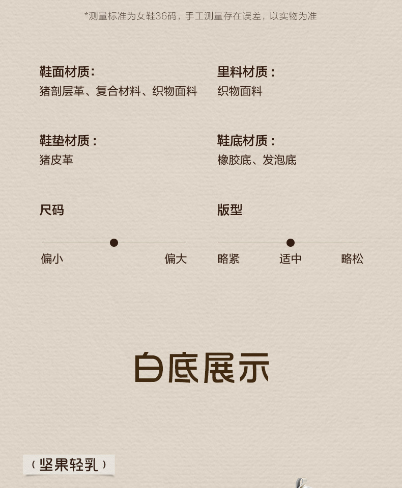 | 款式季节:春季 | 鞋垫材质:猪皮革 | 渠道划分:电商专销 | 前掌高度:无 | 皮质特征:二层皮 |