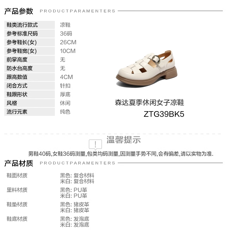 | 鞋头款式:包头 | 鞋底材质:发泡底 | 鞋面图案:纯色 | 鞋跟形状:厚底 | 鞋面材质:复合材料 |