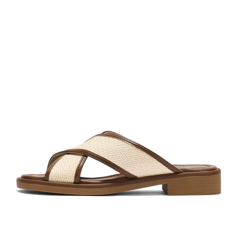 | 鞋头款式:露趾 | 鞋底材质:牛筋底 | 鞋面图案:纯色 | 鞋跟形状:平跟 | 鞋面材质:织物人造革 |