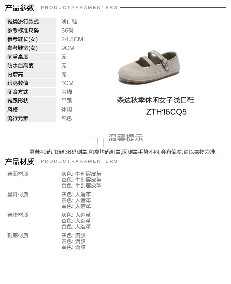 | 皮质特征:二层皮 | 前掌高度:无 | 防水台高度:无 | 鞋类流行款式:浅口鞋 |