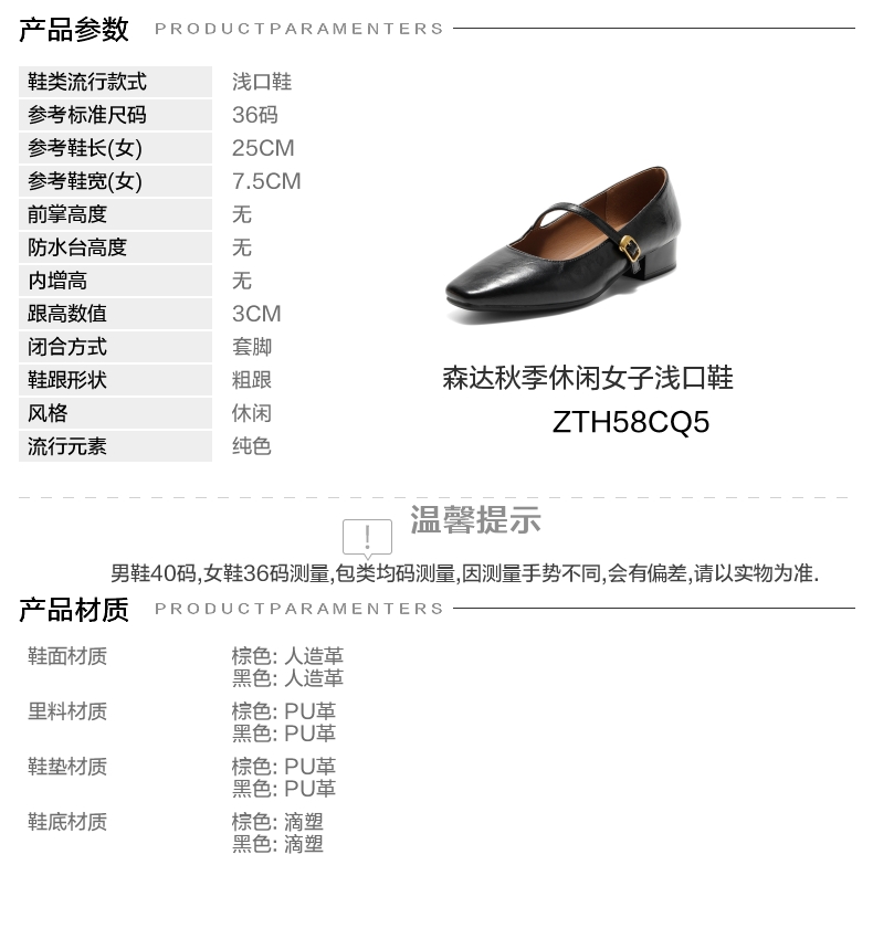 | 皮质特征:人造革 | 前掌高度:无 | 防水台高度:无 | 鞋类流行款式:浅口鞋 |