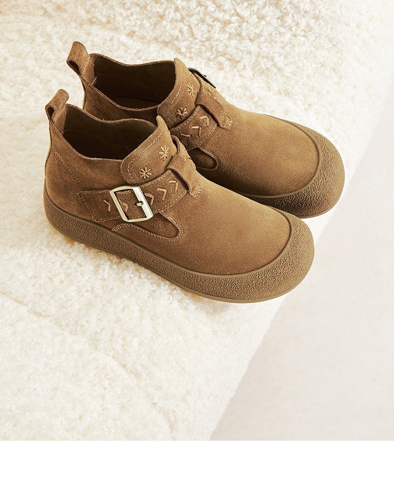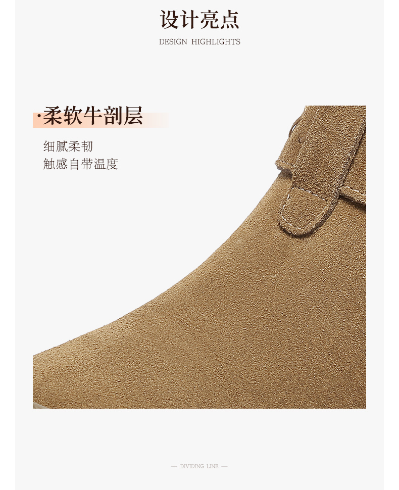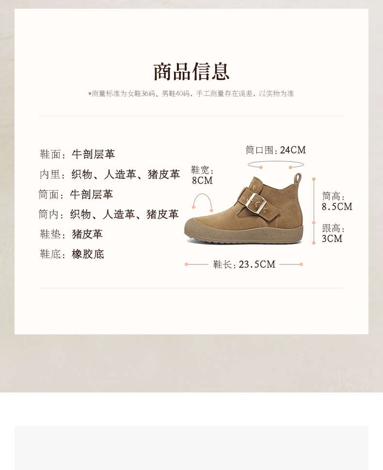 | 帮面材质:牛剖层革 | 配跟:无 | 靴筒口围:24CM | 上市时间:2025年冬季 | 鞋类流行款式:短靴 |