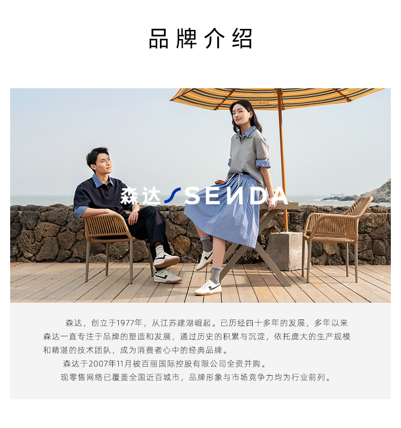 SENDA(森达),品牌成立于1977年,拥有40年发展史,秉承舒适的制鞋理念,从用料到工艺都经过严格质量把控。男鞋以舒适质感著称,覆盖商务正装、商务休闲、时尚休闲三大系列,适用不同场合的需求,同时开发摩克、加州等一系列功能性鞋履,行走体验;女鞋以款式优雅、穿着舒适为主要特征,依时尚潮流添加当季设计元素,每季推出时尚、休闲等系列鞋款,为都市白领提供不同场合的搭配需求。目前门店已覆盖近百座城市,数量达1800多家。