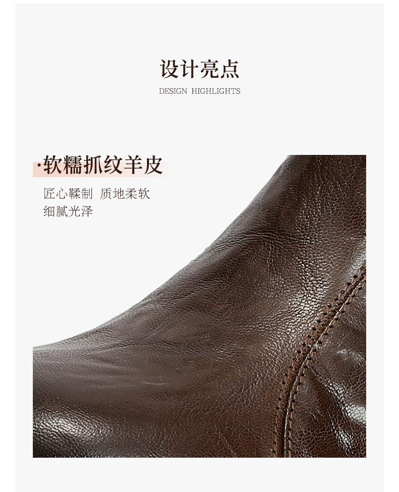 | 鞋底材质:橡胶底 | 靴筒内里材质:织物面料人造革 | 内增高:无 | 鞋面材质:羊皮革 | 闭合方式:后拉链 |