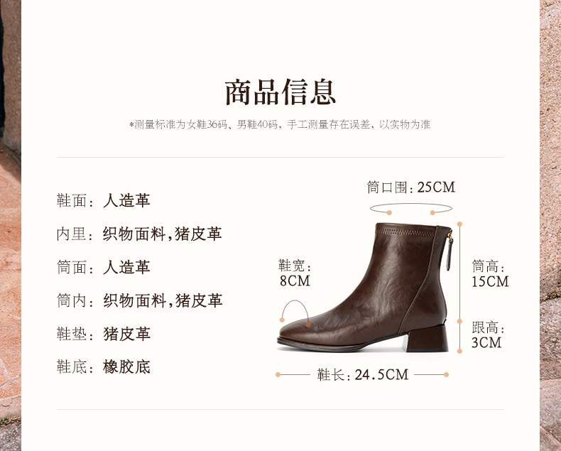 | 配跟:无 | 靴筒口围:25CM | 上市时间:2025年冬季 | 鞋类流行款式:短靴 | 鞋头款式:方头 |