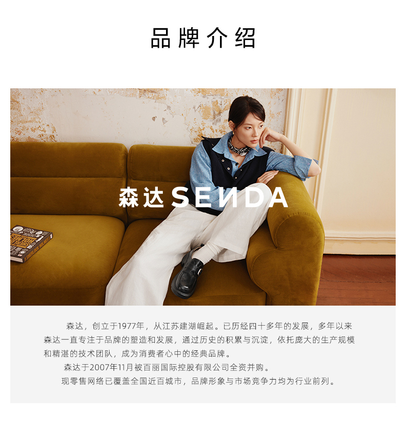 SENDA(森达),品牌成立于1977年,拥有40年发展史,秉承舒适的制鞋理念,从用料到工艺都经过严格质量把控。男鞋以舒适质感著称,覆盖商务正装、商务休闲、时尚休闲三大系列,适用不同场合的需求,同时开发摩克、加州等一系列功能性鞋履,行走体验;女鞋以款式优雅、穿着舒适为主要特征,依时尚潮流添加当季设计元素,每季推出时尚、休闲等系列鞋款,为都市白领提供不同场合的搭配需求。目前门店已覆盖近百座城市,数量达1800多家。