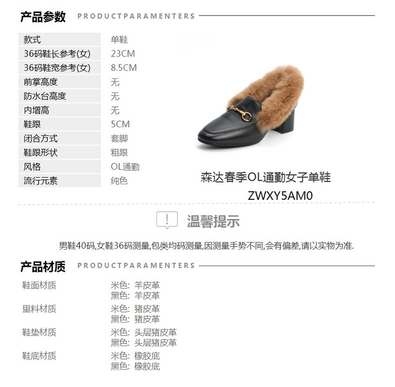 | 跟高数值:5CM | 性别:女子 | 里料材质:猪皮革 | 制鞋工艺:胶贴皮鞋 | 鞋垫材质:头层猪皮革 |