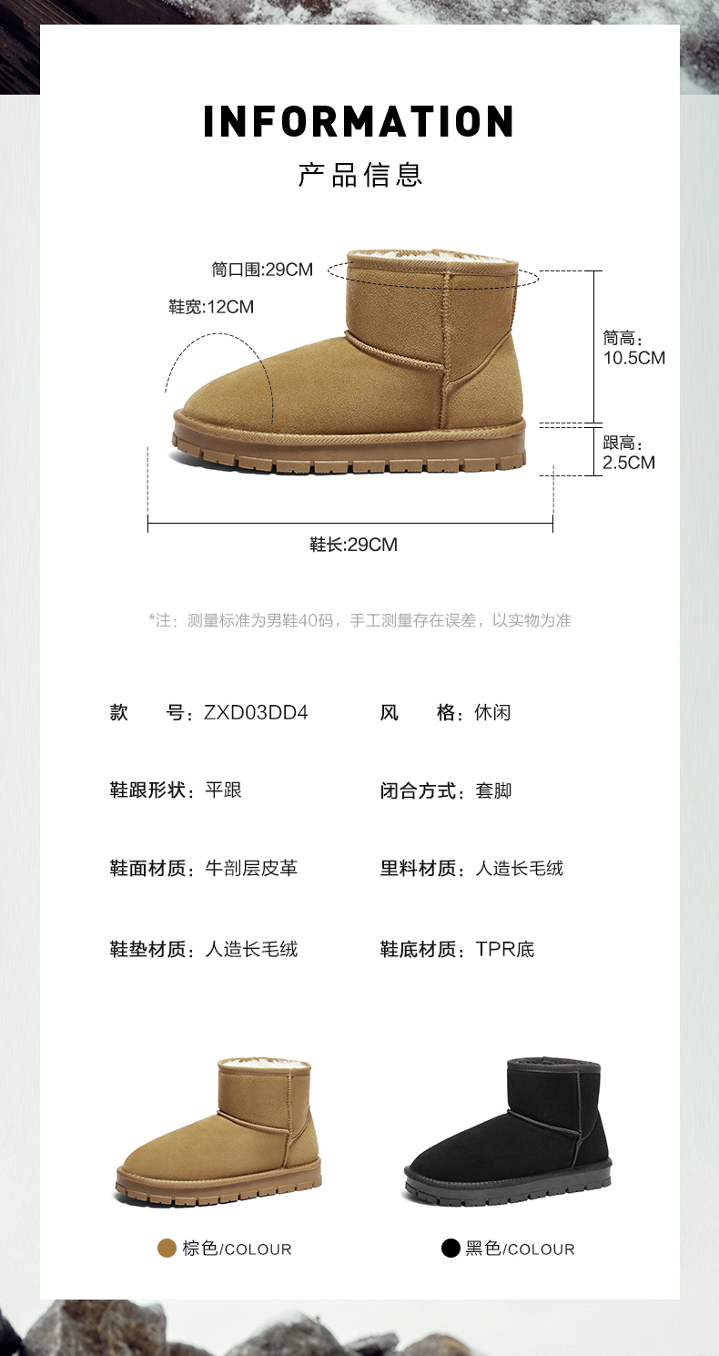 | 40码鞋长参考(男):29CM | 鞋底材质:TPR底 | 靴筒内里材质:人造长毛绒 | 内增高:无 | 鞋面材质:牛剖层皮革 |