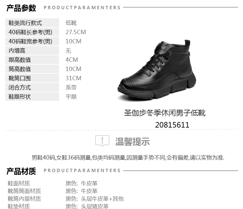 | 40码鞋宽参考(男):10CM | 靴筒口围:31CM | 鞋类流行款式:低靴 | 鞋头款式:圆头 | 鞋面图案:纯色 |